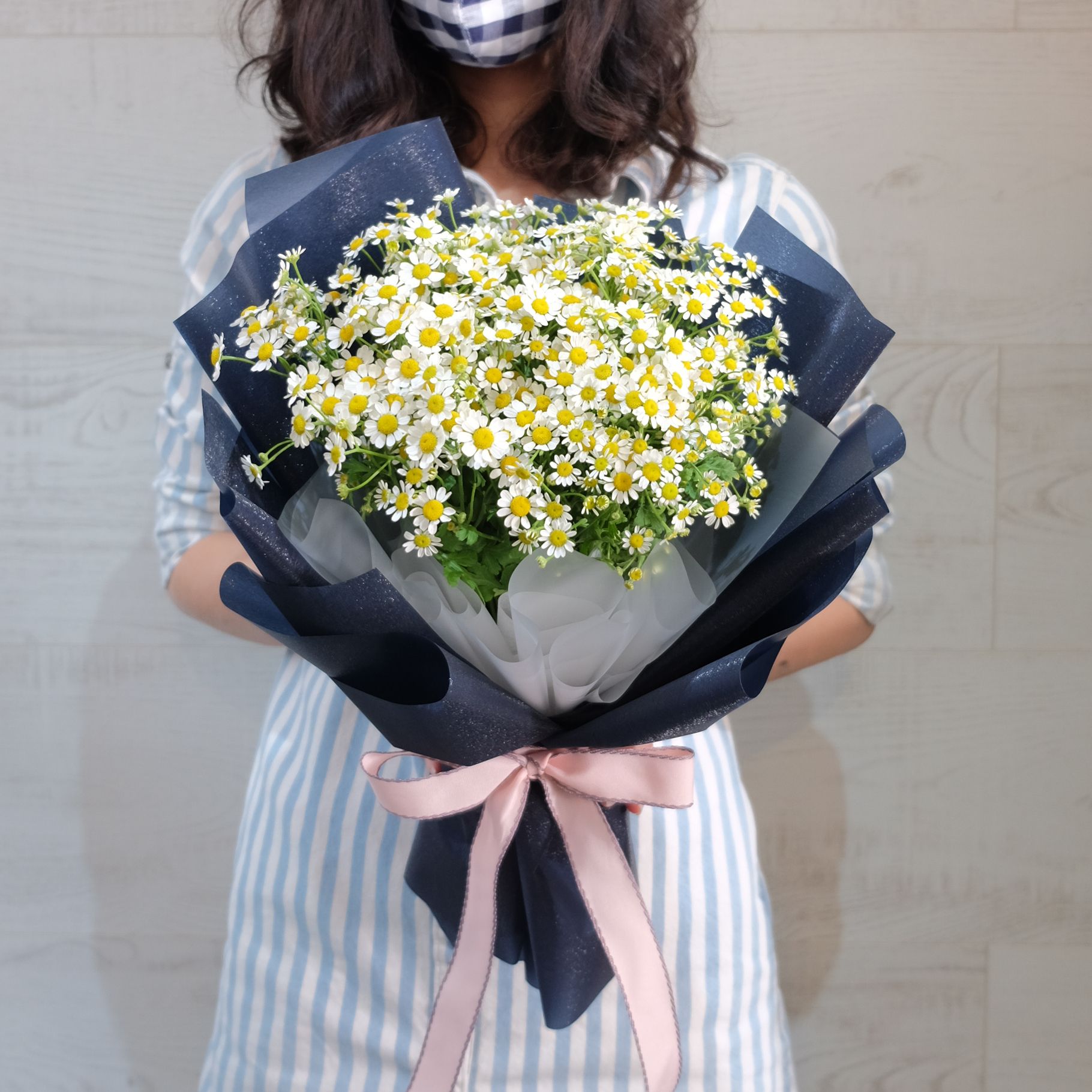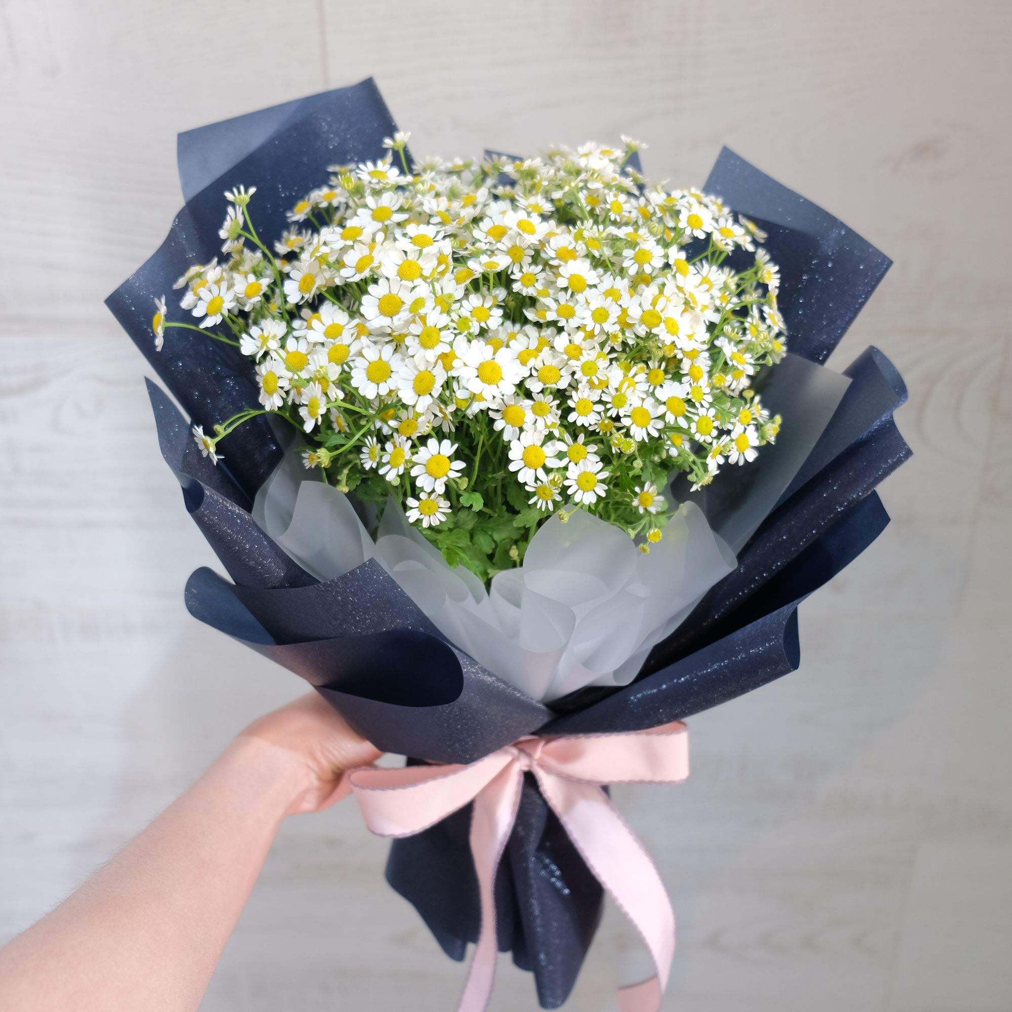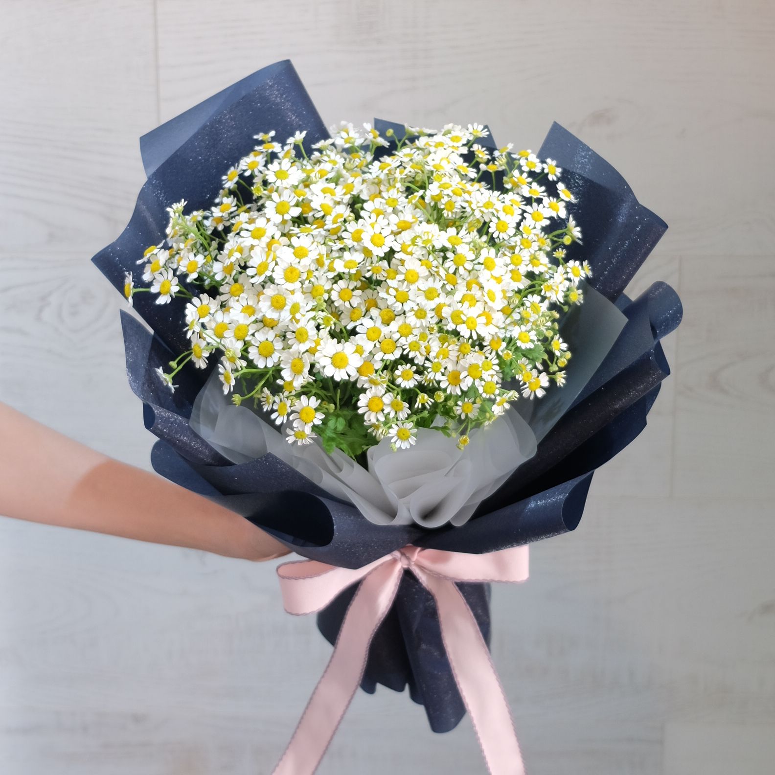 ช่อเดซี่ ห่อด้วยกระดาษสีน้ำเงินเข้ม
