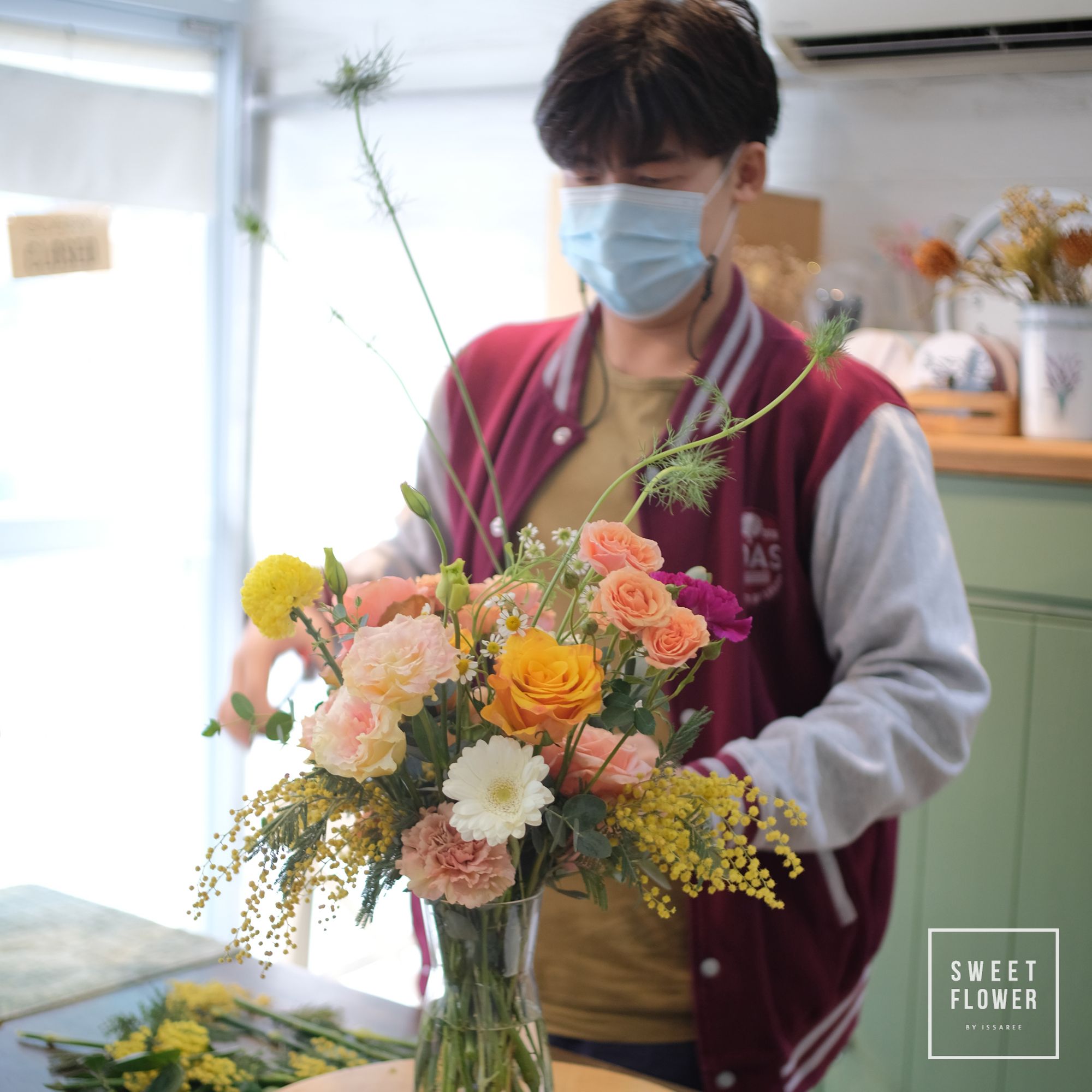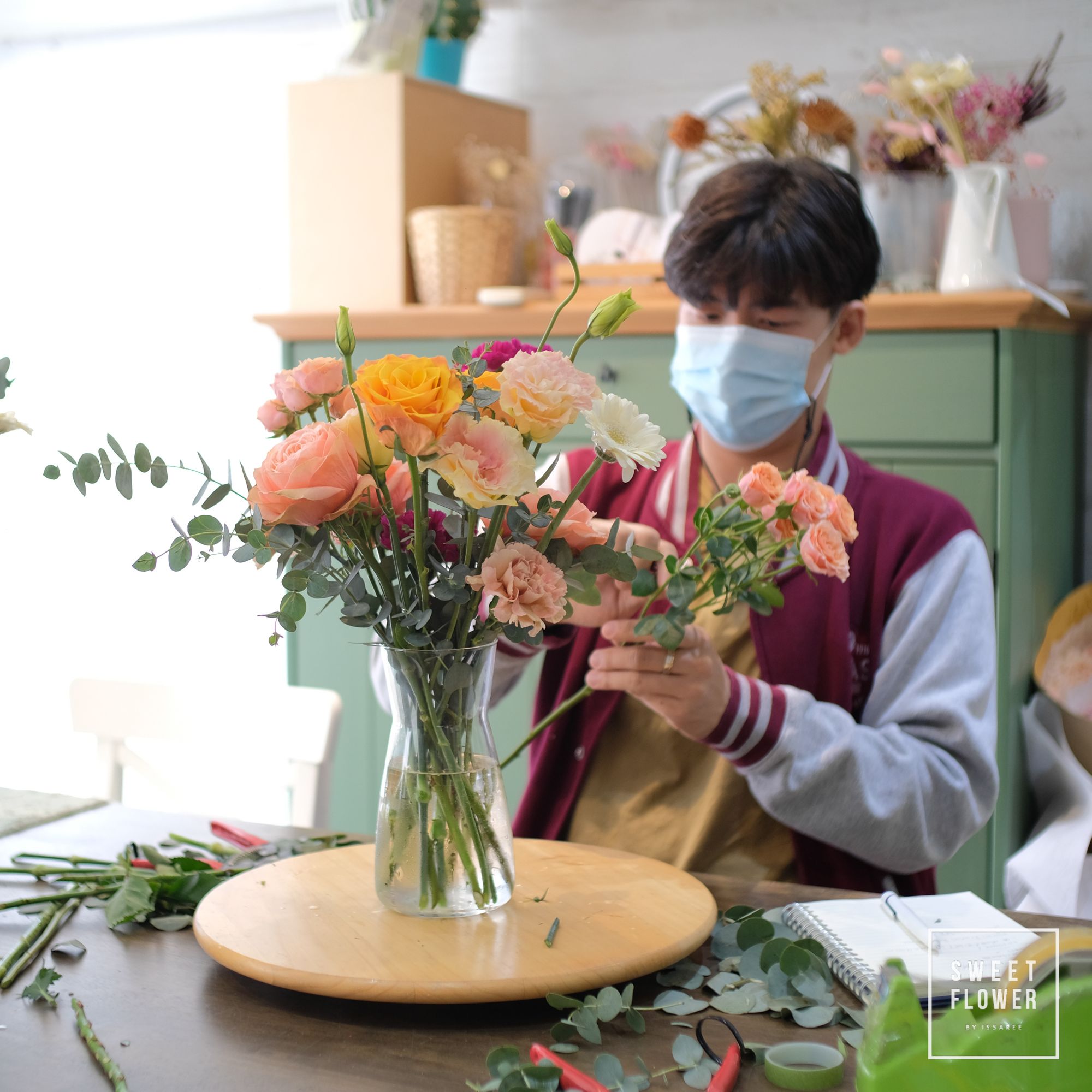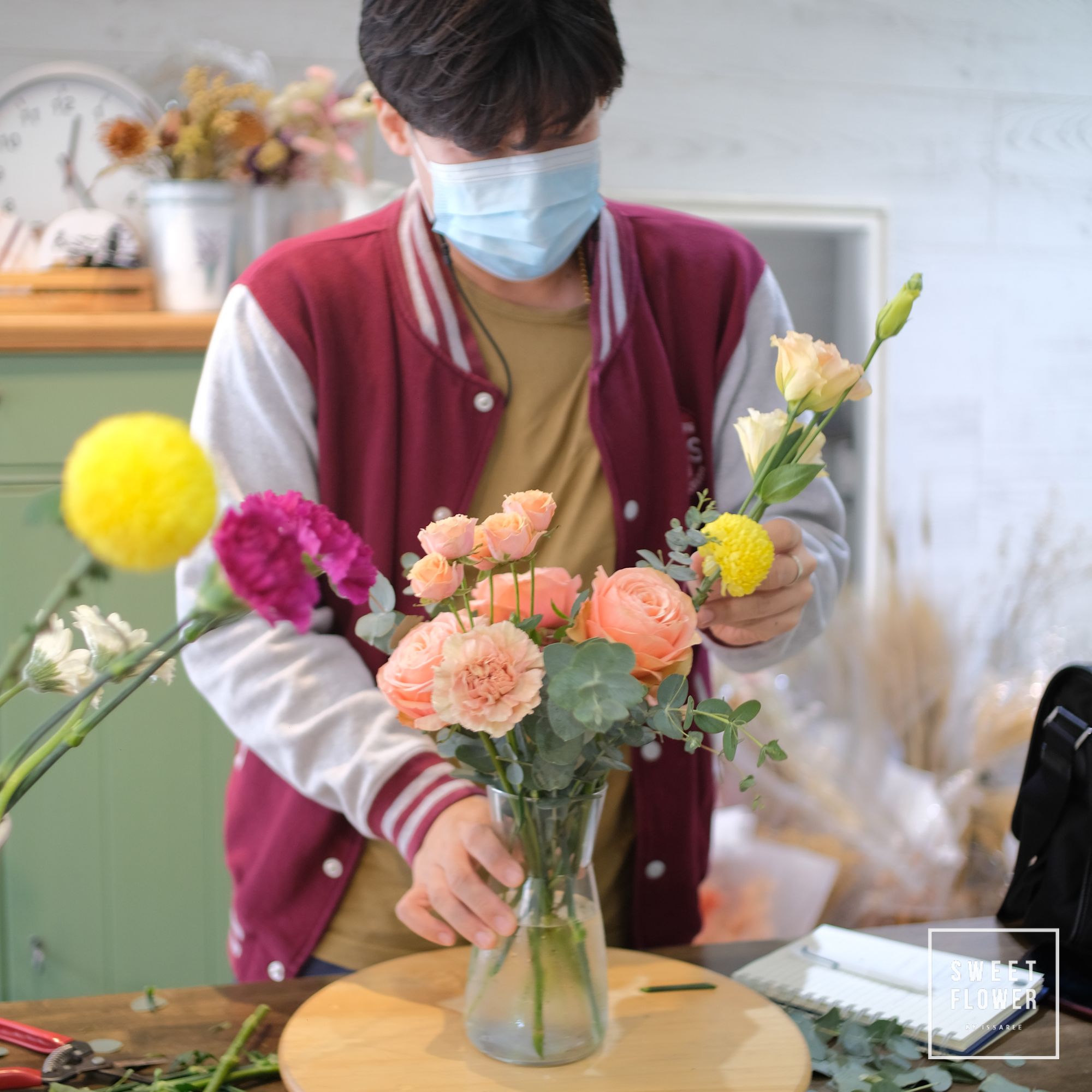 ภาพบรรยากาศ การเรียนจัดแจกันแบบส่วนตัวที่ร้าน ในช่วง Covid มีนักเรียนมาเรียนจัดดอกไม้หลากหลายอาชีพหลากหลายวัย จัดเสร็จสามารถนำกลับไปบ้านได้เลยนะคะ การเรียนการสอนของทางร้านจะเน้นการลงมือทำด้วยตัวเองทุกขั้นตอน