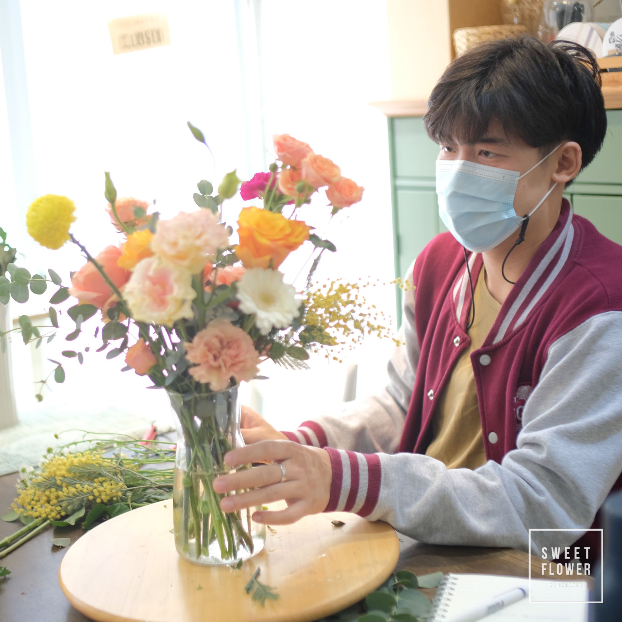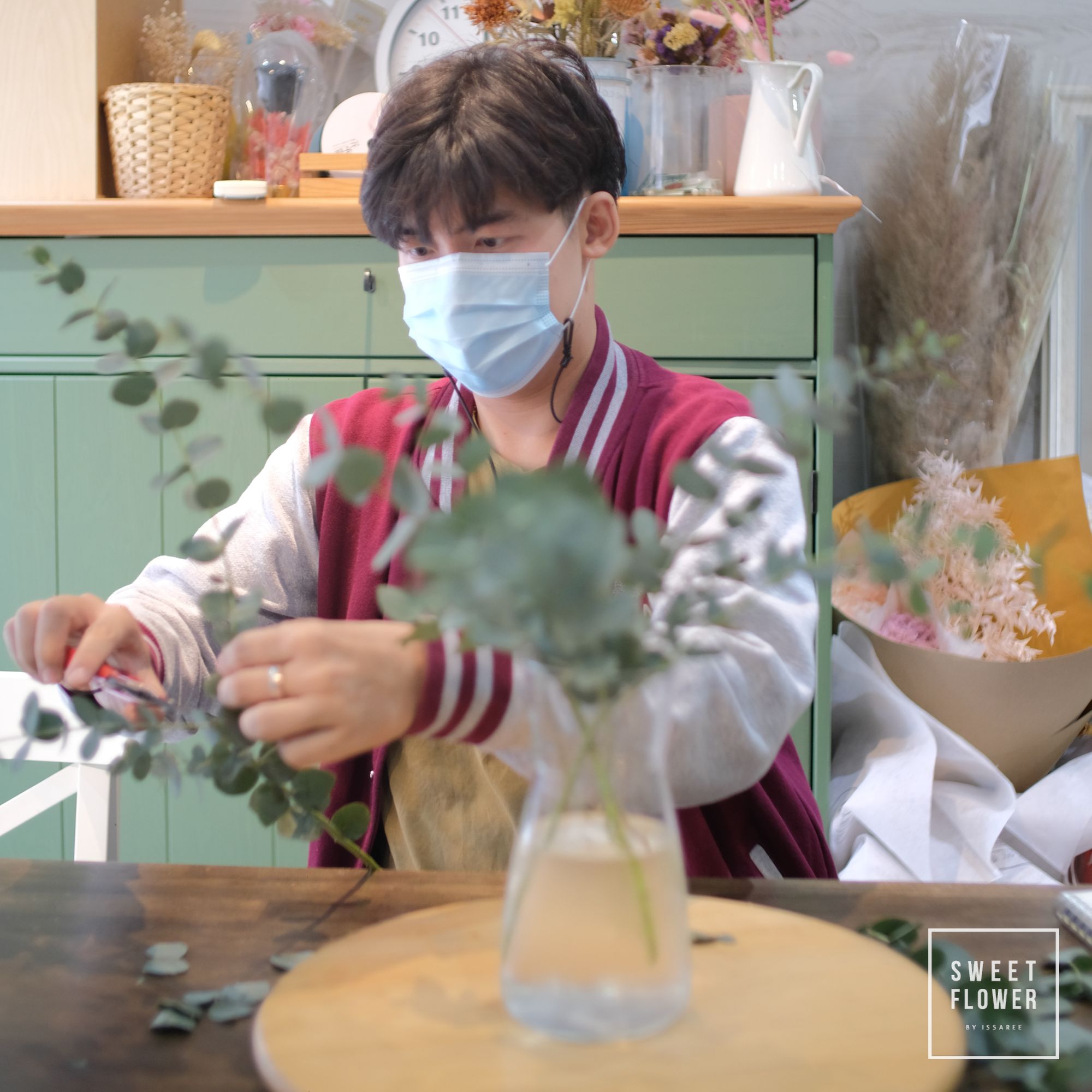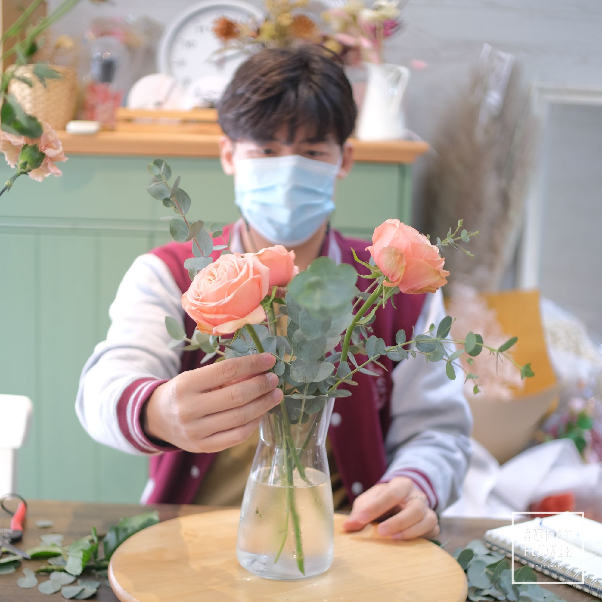 ภาพบรรยากาศ การเรียนจัดแจกันแบบส่วนตัวที่ร้าน ในช่วง Covid มีนักเรียนมาเรียนจัดดอกไม้หลากหลายอาชีพหลากหลายวัย จัดเสร็จสามารถนำกลับไปบ้านได้เลยนะคะ การเรียนการสอนของทางร้านจะเน้นการลงมือทำด้วยตัวเองทุกขั้นตอน