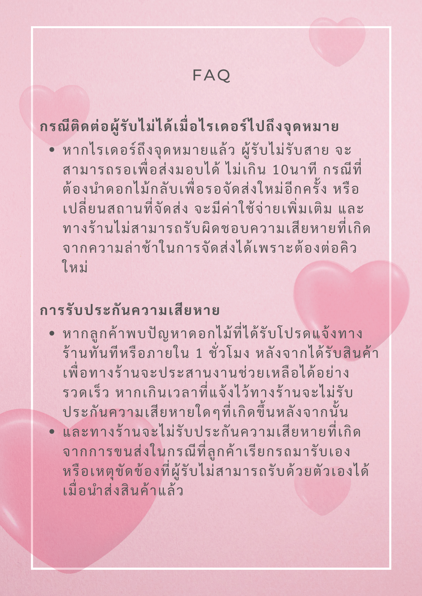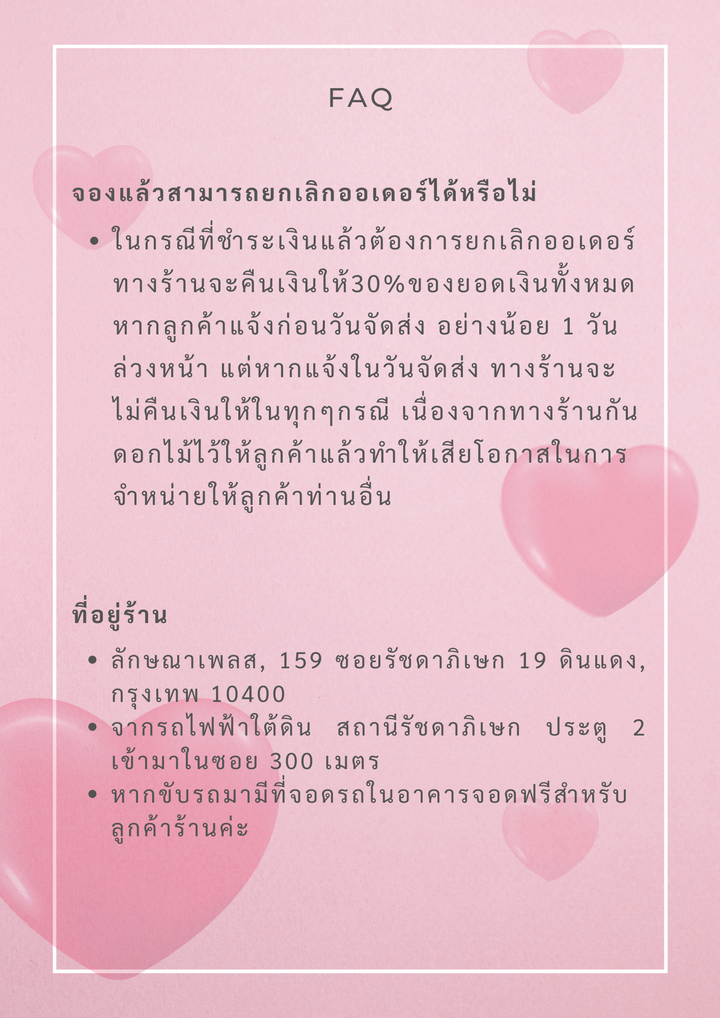 - หากโอนชำระแล้วให้แจ้งทางร้านอีกครั้งพร้อมหลักฐานเพื่อยืนยันการโอนชำระ รวมถึงรายละเอียดชื่อและเบอร์ติดต่อผู้รับ ข้อความเขียนการ์ดหากมี