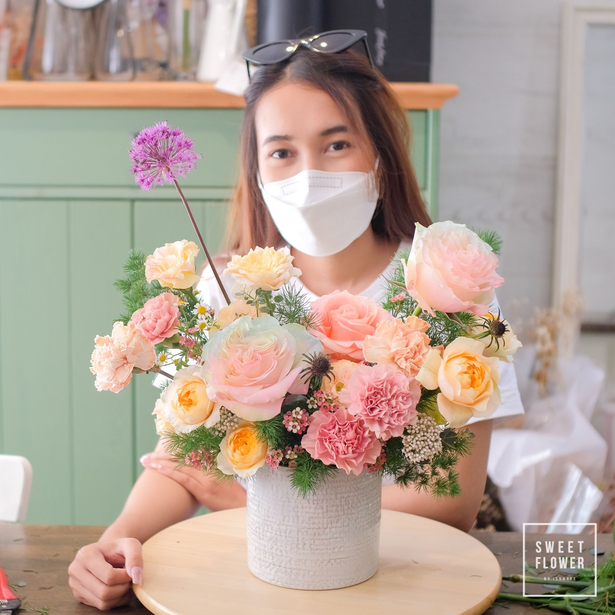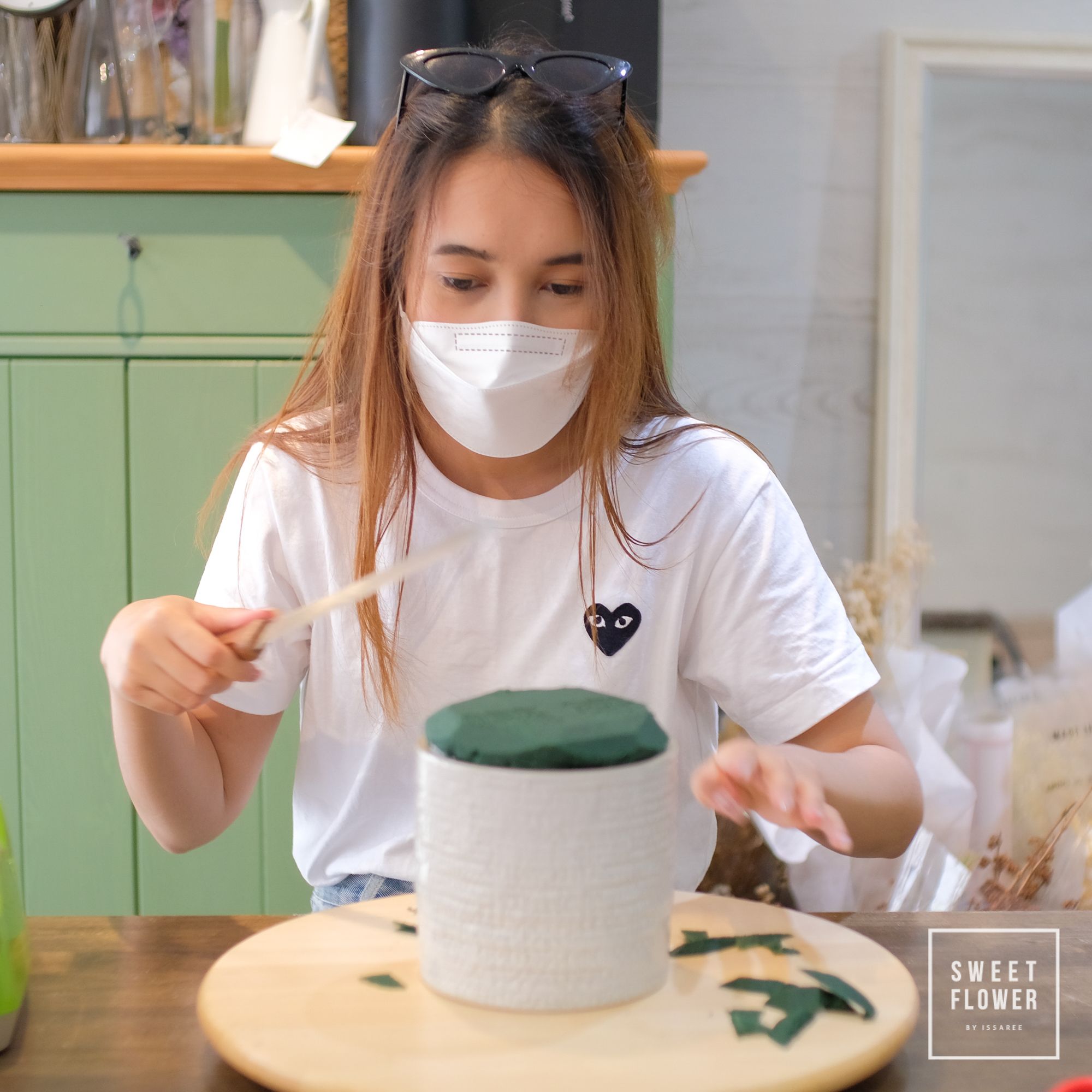 ใช้ดอกไม้นำเข้าทั้งหมดในการเรียนนะคะ จัดเสร็จนำผลงานกลับบ้านได้พร้อมความรู้และเทคนิคที่นำไปใช้งานได้จริง